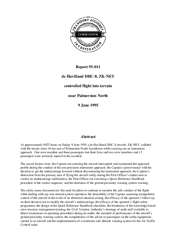 TAIC - Report 95-011 DH8A CFIT near Palmerston North, 9 June 1995