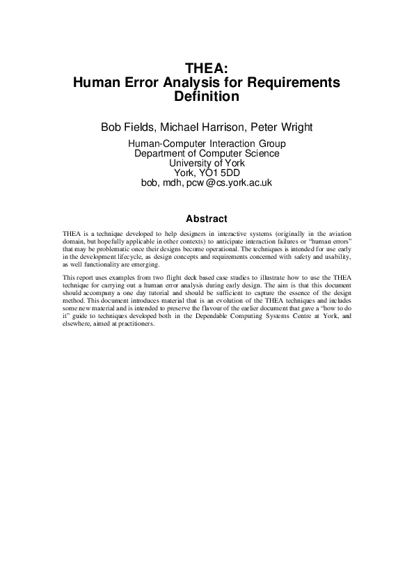 THEA is a technique developed to help designers in interactive systems (originally in the aviation domain, but hopefully applicable in other contexts) to anticipate interaction failures or “human errors that may be problematic once their designs become operational. The techniques is intended for use early in the development lifecycle, as design concepts and requirements concerned with safety and usability, as well functionality are emerging. This report uses examples from two flight deck based case studies to illustrate how to use the THEA technique for carrying out a human error analysis during early design.