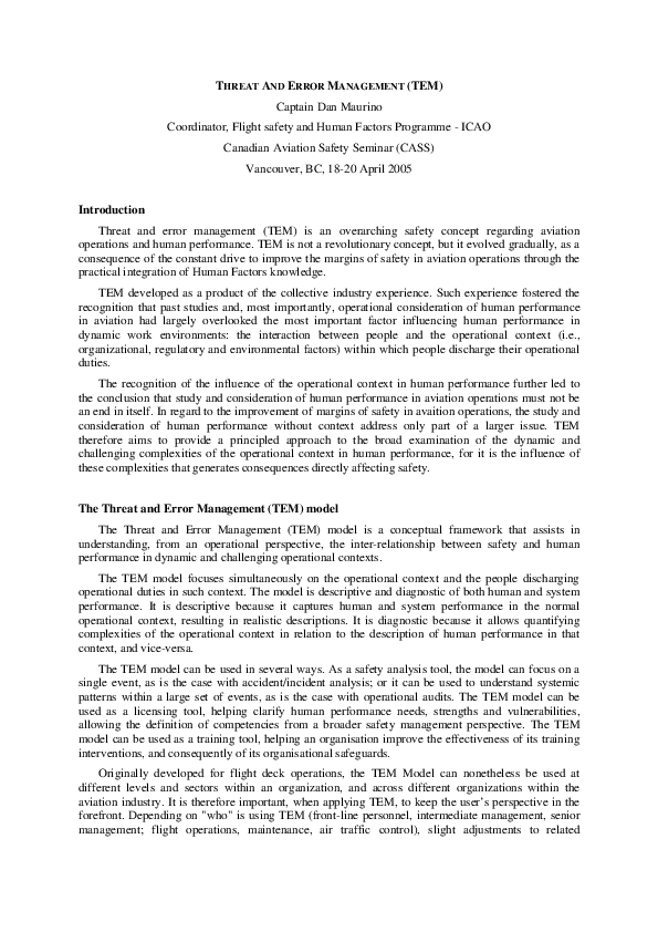 The Threat and Error Management (TEM) model is a conceptual framework that assists in understanding, from an operational perspective, the inter-relationship between safety and human performance in dynamic and challenging operational contexts. The TEM model focuses simultaneously on the operational context and the people discharging operational duties in such context. The model is descriptive and diagnostic of both human and system performance. It is descriptive because it captures human and system performance in the normal operational context, resulting in realistic descriptions. It is diagnostic because it allows quantifying complexities of the operational context in relation to the description of human performance in that context, and vice-versa.