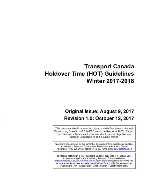 Transport Canada Holdover Time (HOT) Guidelines Winter 2017-2018