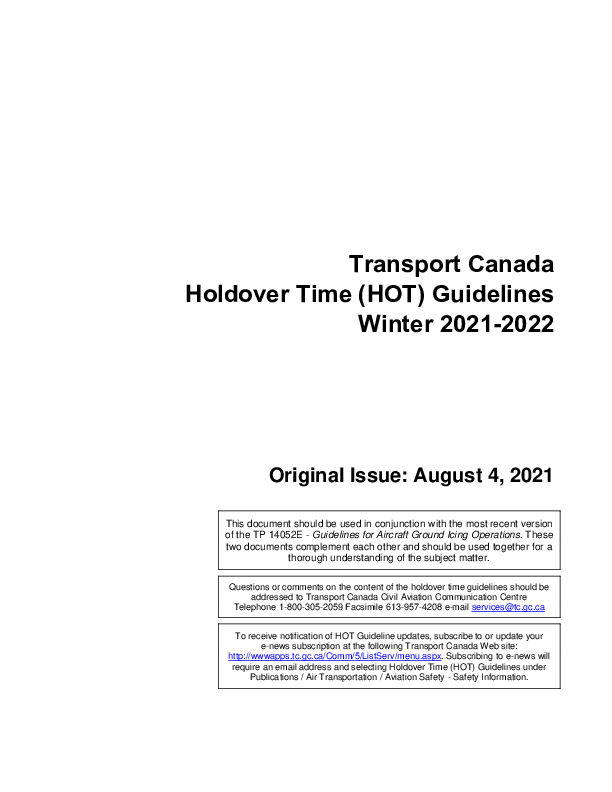 Transport Canada Holdover Time (HOT) Guidelines Winter 2021-2022