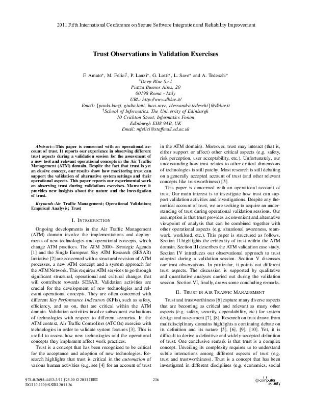 Paper presented to 2011 Fifth International Conference on Software Integration and Reliability Improvement. Abstract: This paper is concerned with an operational account of trust. It reports our experience in observing different trust aspects during a validation session for the assessment of a new tool and relevant operational concepts in the Air Traffic Management (ATM) domain. Despite the fact that trust is yet an elusive concept, our results show how monitoring trust can support the validation of alternative system settings and their operational aspects. This paper reports our experimental work on observing trust during validations exercises. Moreover, it provides new insights about the nature and the investigation of trust.