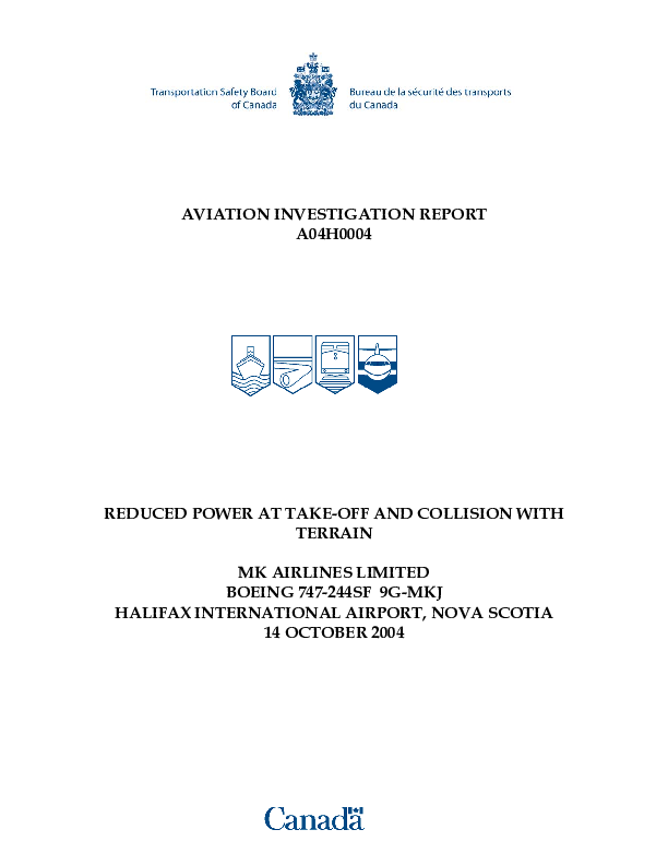On 14 October 2004, an MK Airlines Limited Boeing 747-244SF (registration 9G-MKJ, serial number 22170) was being operated as a non-scheduled international cargo flight from Halifax, Nova Scotia, to Zaragoza, Spain. At about 0654 coordinated universal time, 0354 Atlantic daylight time, MK Airlines Limited Flight 1602 attempted to take off from Runway 24 at the Halifax International Airport. The aircraft overshot the end of the runway for a distance of 825 feet, became airborne for 325 feet, then struck an earthen berm. The aircraft's tail section broke away from the fuselage, and the aircraft remained in the air for another 1200 feet before it struck terrain and burst into flames. The aircraft was destroyed by impact forces and a severe post-crash fire. All seven crew members suffered fatal injuries.