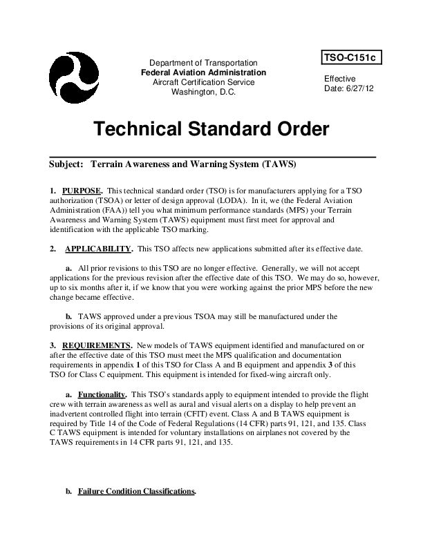 With this TSO the FAA states the minimum performance standards that Terrain Awareness and Warning System (TAWS) equipment must first meet for approval and identification with the applicable TSO marking.