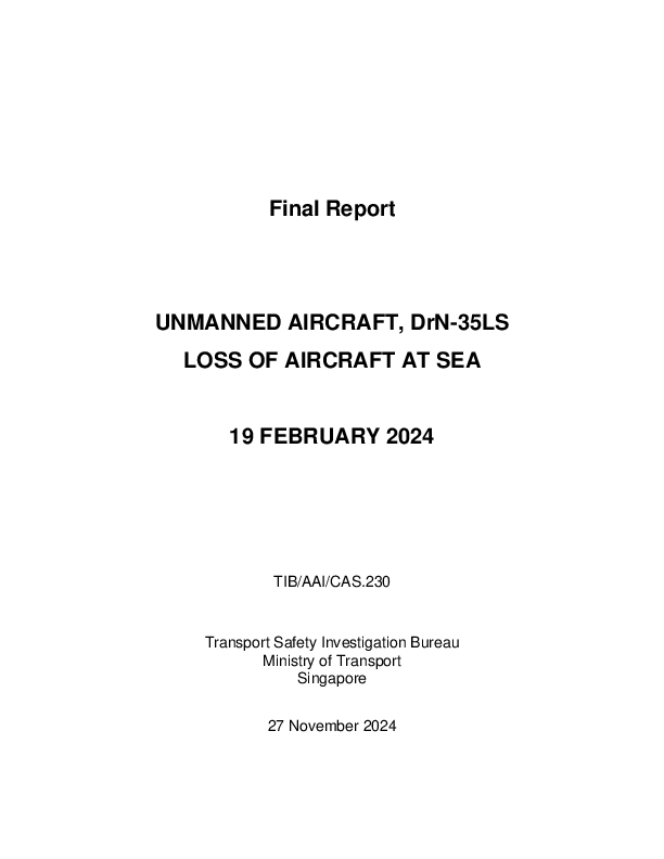 On 19 February 2024, a relatively experienced UAV pilot lost control of a ST Engineering Aerospace DrN-355LS whilst operating it on a BVLOS flight about one mile over water from their Sentosa Island location. A brief interruption in receipt of the GNSS position signal by the UAV required the pilot to take control manually but when their attempt to do so did not follow the correct procedure within the allowed 5 seconds, control was lost and the UAV ditched and sank and was not recovered. Improvements to pilot access to and training for reversion to manual control were recommended.