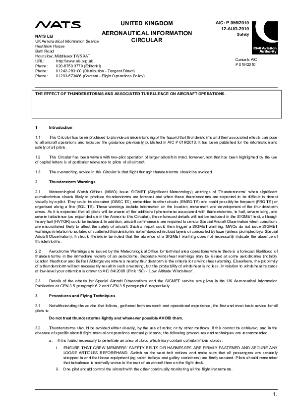 UK AIC P 056/2010: The Effect of Thunderstorms and Associated Turbulence on Aircraft Operations