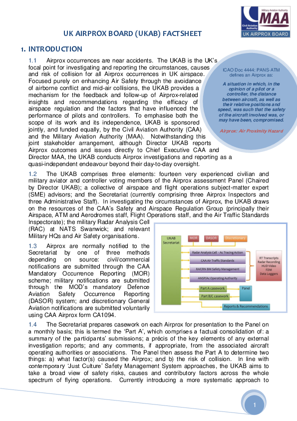 The UKAB is the UKs focal point for investigating and reporting the circumstances, causes and risk of collision for all Airprox occurrences in UK airspace.