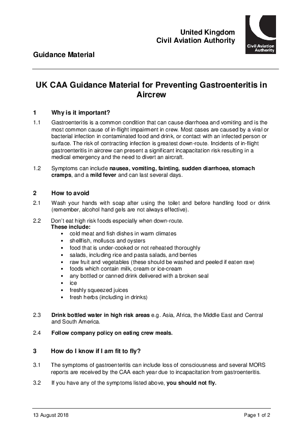 UK CAA CAP 1703: Aircrew guide to gastroenteritis