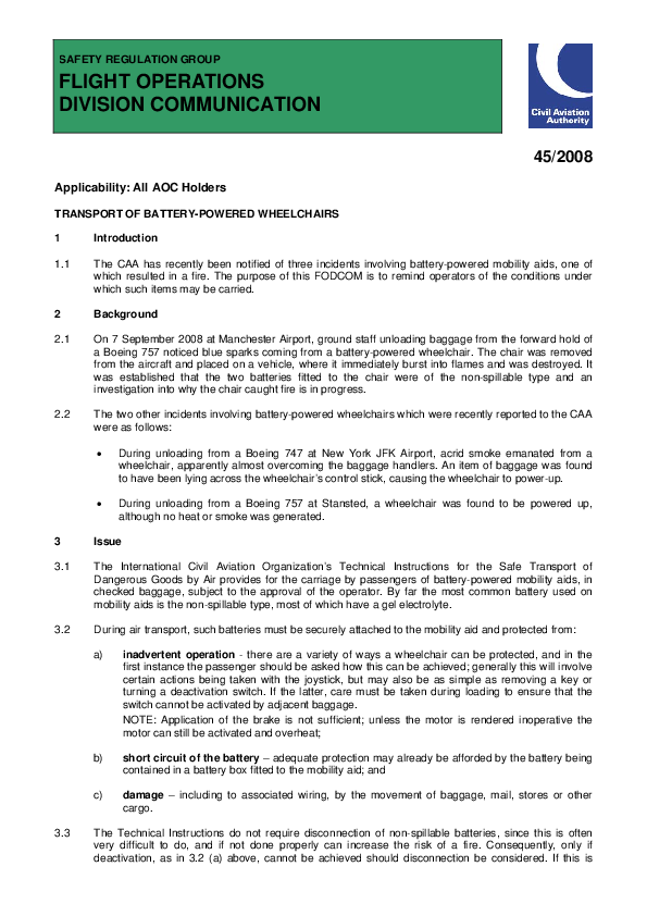 UK CAA - FODCOM 45/2008 Transport of Battery Powered Wheelchairs