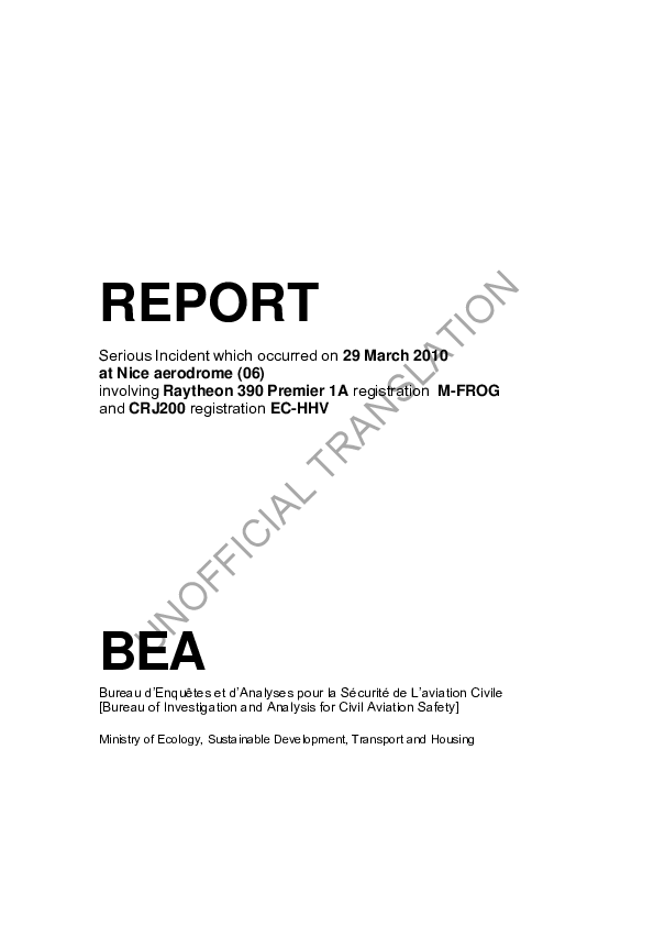(Unofficial English translation) Runway incursion, PRM1 and CRJ2, Nice France, 29 March 2010