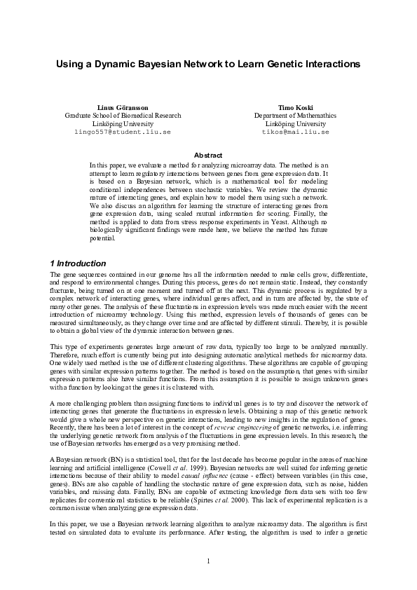 In this paper, we evaluate a method for analyzing microarray data. The method is an attempt to learn regulatory interactions between genes from gene expression data. It is based on a Bayesian network, which is a mathematical tool for modeling conditional independences between stochastic variables. We review the dynamic nature of interacting genes, and explain how to model them using such a network. We also discuss an algorithm for learning the structure of interacting genes from gene expression data, using scaled mutual information for scoring.