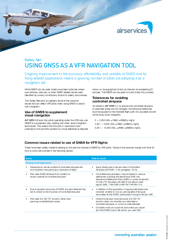 Concise guide by AirServices Australia on using GNSS as a VFR navigation tool. The guide is cross referenced to the Australian AIP.