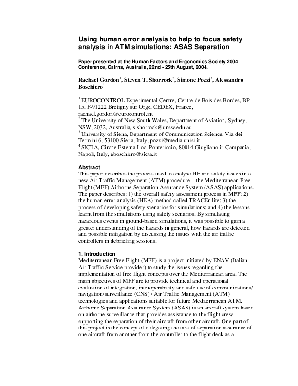 This paper describes the process used to analyse HF and safety issues in a new Air Traffic Management (ATM) procedure the Mediterranean Free Flight (MFF) Airborne Separation Assurance System (ASAS) applications. The paper describes: 1) the overall safety assessment process in MFF; 2) the human error analysis (HEA) method called TRACEr-lite; 3) the process of developing safety scenarios for simulations; and 4) the lessons learnt from the simulations using safety scenarios. By simulating hazardous events in ground-based simulations, it was possible to gain a greater understanding of the hazards in general, how hazards are detected and possible mitigation by discussing the issues with the air traffic controllers in debriefing sessions.