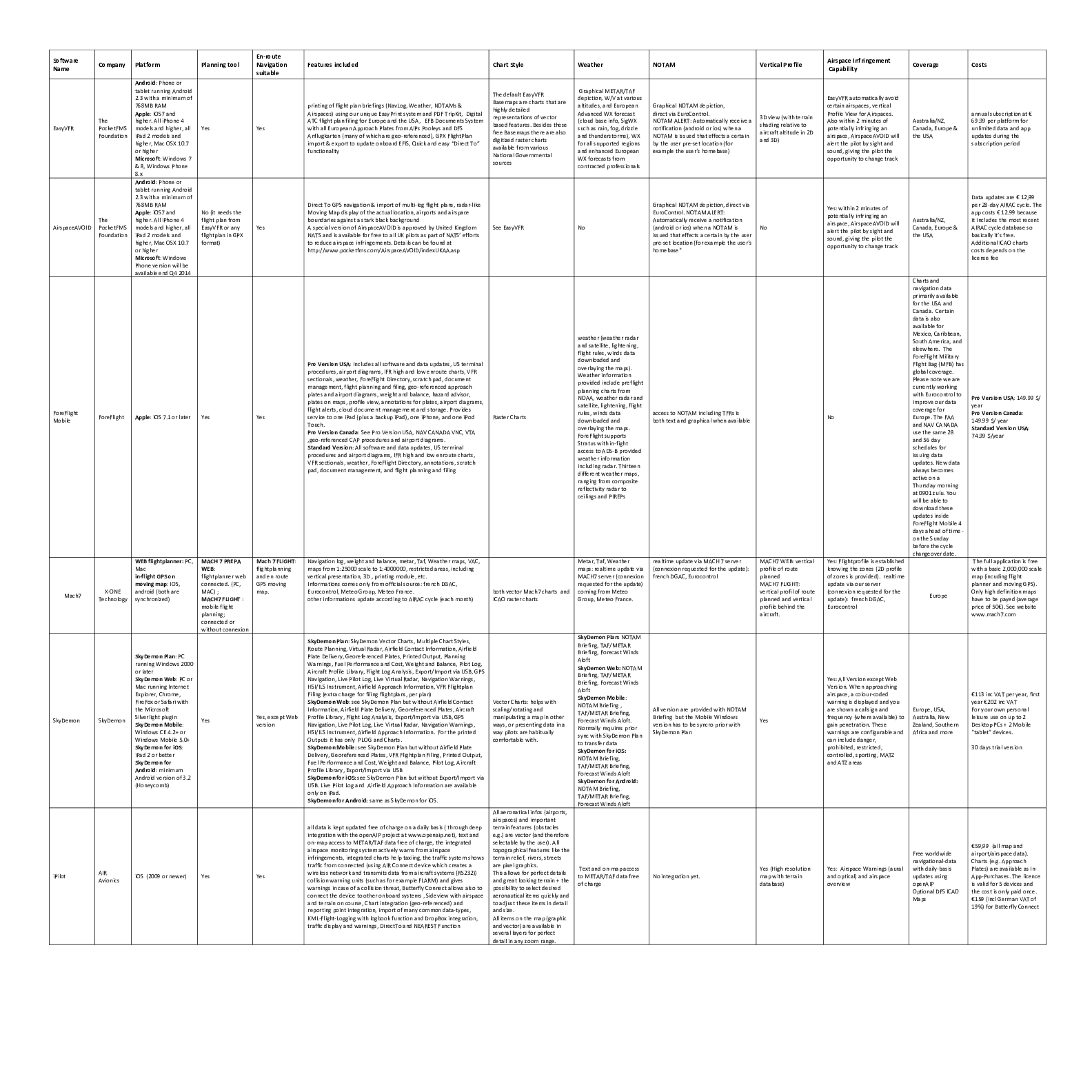 VFR Navigation software products - information chart
