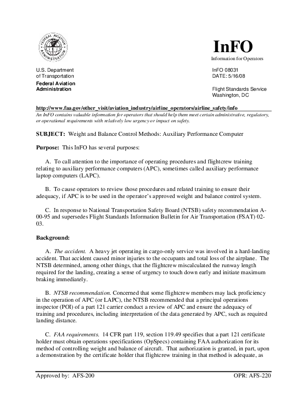 Weight and Balance Control Methods: Auxiliary Performance Computer
