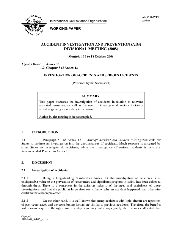 Working Paper - Accident Prevention (AIG) Divisional Meeting 2008, Montréal, 13 to 18 October 2008