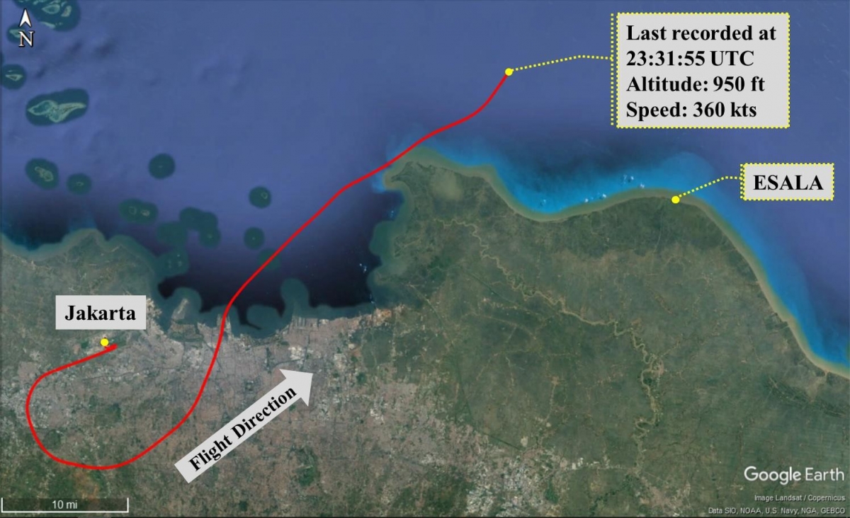 About 35 minutes later, a boat in the vicinity reported finding floating debris about 33 nm from Jakarta on a bearing of 056° and this was subsequently identified as from the accident aircraft. This and all other wreckage subsequently recovered confirmed that a high energy impact had occurred.