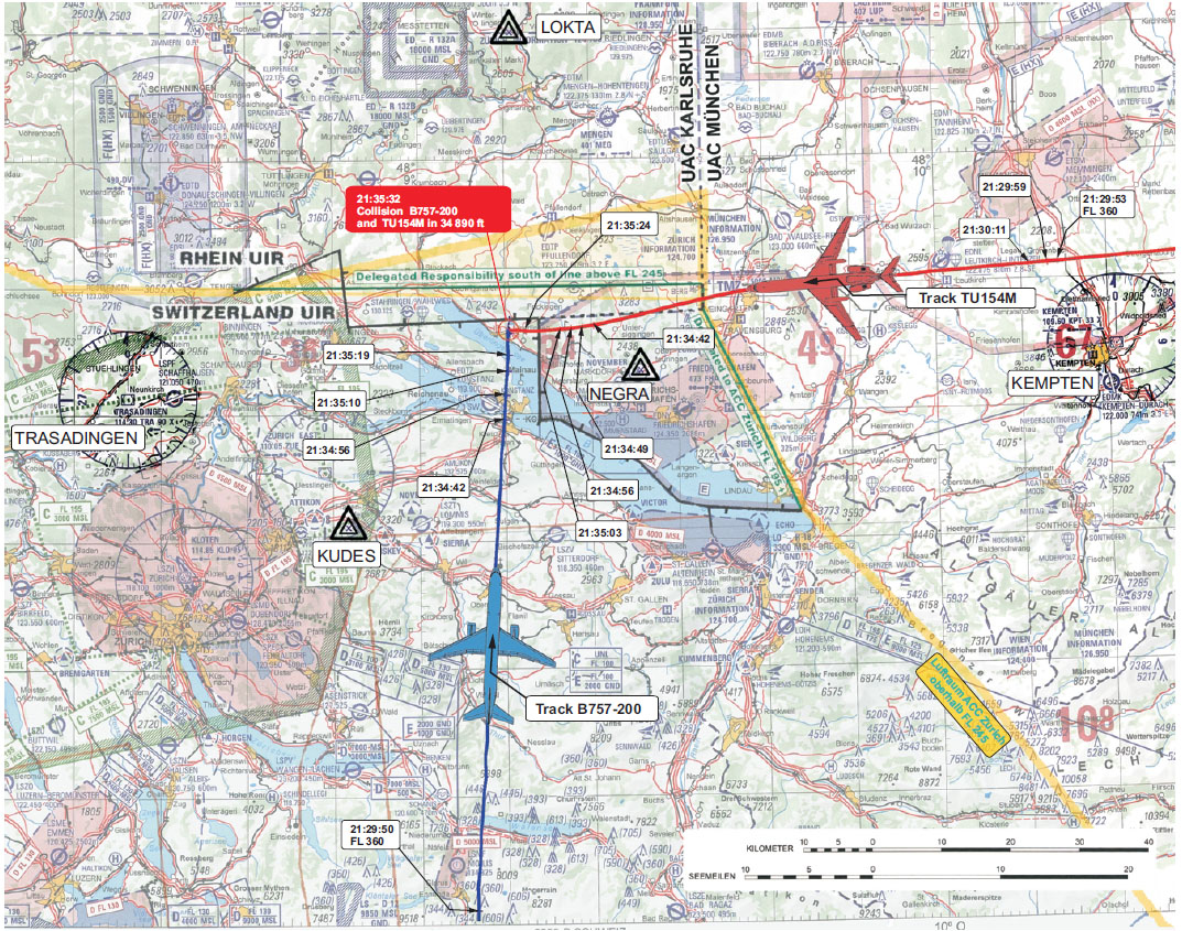 It was established that both aircraft had been under the control of Zurich ACC in accordance with a delegation agreement between the German and Swiss ANSPs. At the time of the accident the Zurich ACC was being operated by a single controller supported by an assistant, which was as per prevailing Unit SOPs. Maintenance was in progress at the ACC overnight which meant that the radar system was functioning in “fallback” mode under which minimum lateral separation was increased to 7nm from the normal 5nm.