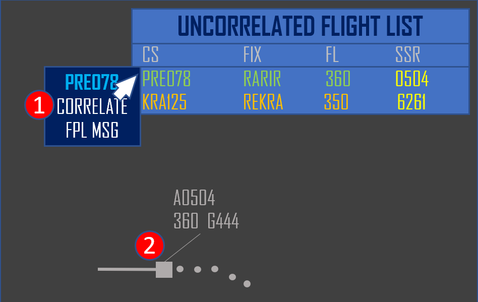 Manual correlation is done using a dedicated system feature, e.g. by clicking on a flight in a flight list window then choosing the "correlate" option and finally clicking on an uncorrelated track (regardless of its type - primary or secondary).