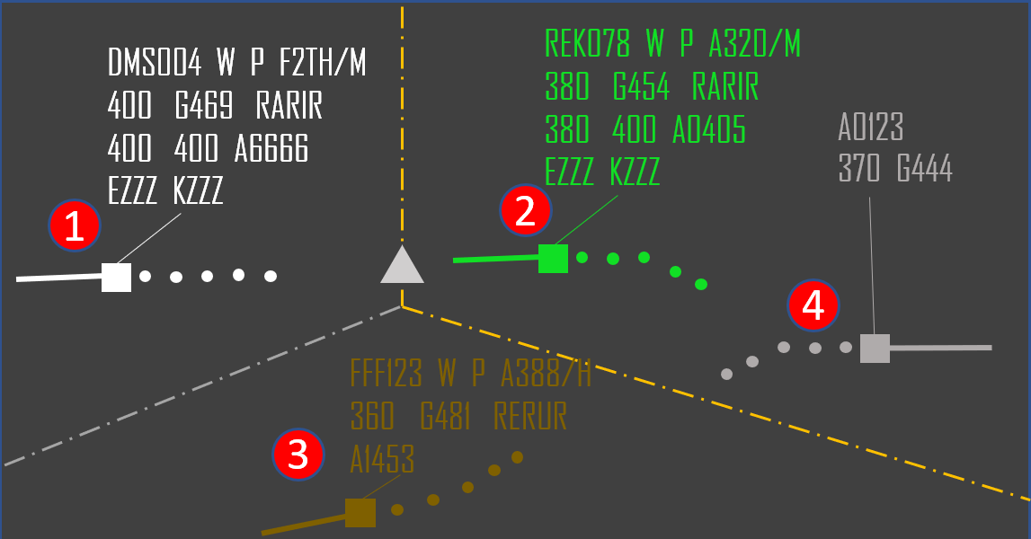 Example of colour coding. Flight (1) is controlled by the sector, (2) is going to enter the sector, (3) is controlled by another sector and (4) is uncorrelated and is controlled by the next ATS unit.