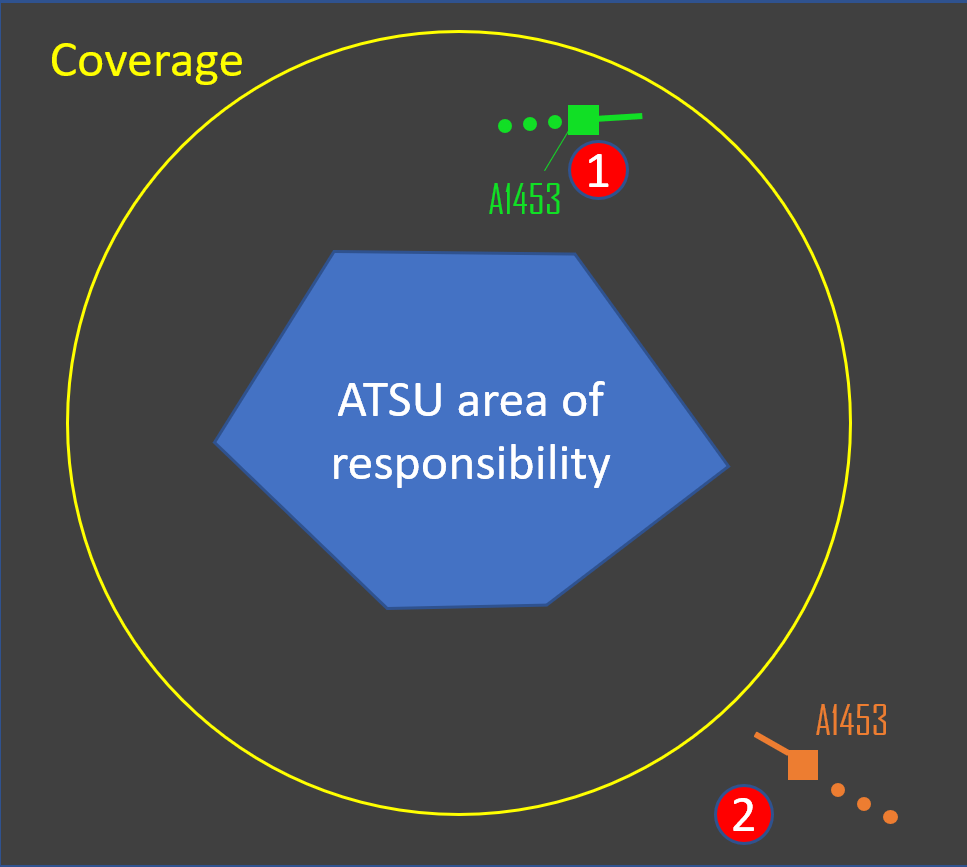 Example of wrong automatic correlation. ACT message is received for aircraft (2) but since it is not within cover yet and there is an aircraft with the expected SSR code, the system will correlate the flight plan to aircraft (1)