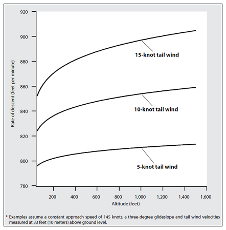 The figure above shows that a 10-knot tail wind, which in most cases is accepted by ATC in the process of runway configuration choice, for a constant approach speed of 145 knots and at 1500 feet requires rate of descent of 850 feet per minute. At 1000 feet rate of descent is reduced by only 10-20 feet.